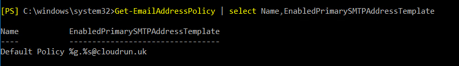 Get-EmailAddressPolicy | select Name,EnabledPrimarySMTPAddressTemplate