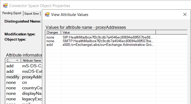 If you open the error you will see what it is trying to update, in this case, it is adding an X500 address to the proxyAddresses attribute: