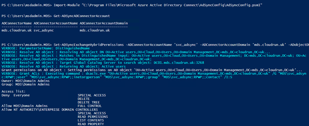 Set-ADSyncExchangeHybridPermissions -ADConnectorAccountName 'svc_adsync' -ADConnectorAccountDomain 'mds.cloudrun.uk' -ADobjectDN 'OU=Active users,OU=Cloud,OU=Users,OU=Domain Management,DC=mds,DC=cloudrun,DC=uk'