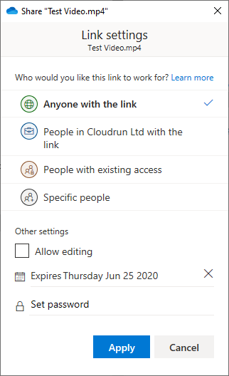 - Set an expiration date if you want to, so that the sharing link automatically expires (a good idea to set this).